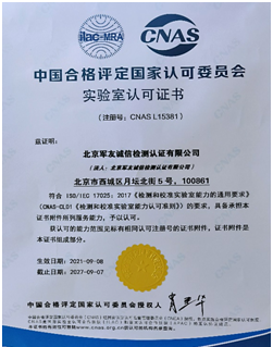 2021年9月8日,北京軍友誠(chéng)信檢測(cè)認(rèn)證有限公司(以下簡(jiǎn)稱公司)正式獲得中國(guó)合格評(píng)定國(guó)家認(rèn)可委員會(huì)(CNAS)授予的實(shí)驗(yàn)室認(rèn)可證書,同時(shí)也通過了國(guó)防實(shí)驗(yàn)室(DiLAC)認(rèn)可,這表明公司檢測(cè)的技術(shù)能力和管理水平均達(dá)到認(rèn)可準(zhǔn)則要求,并正式成為具備國(guó)際互認(rèn)資格的檢測(cè)實(shí)驗(yàn)室。