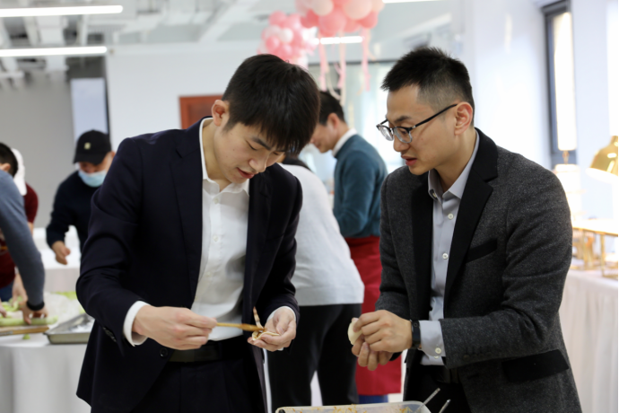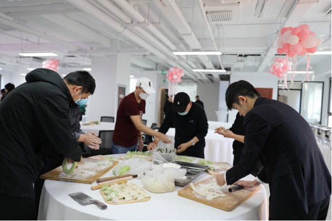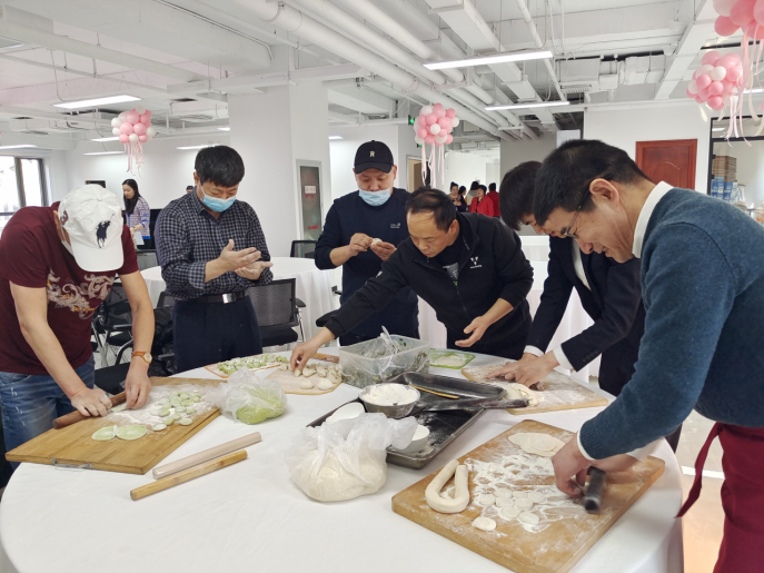 在活動現場公司男同志們主動走進廚房,紛紛大顯身手,親自掌廚,展示自己的精湛廚藝,大家圍在一起有人和面、有人搟餃子皮、有人添餡捏邊,每一個步驟,每一個動作,都透露著對女職工的祝福,歡樂的氛圍充斥著整個大廳。