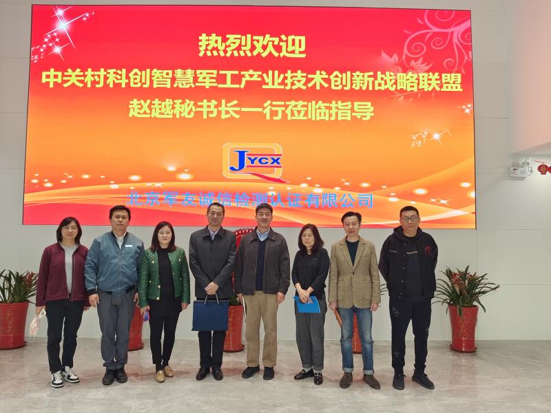 3月31日,中關(guān)村科創(chuàng)智慧軍工產(chǎn)業(yè)技術(shù)創(chuàng)新戰(zhàn)略聯(lián)盟秘書長(zhǎng)趙越、副秘書長(zhǎng)張中輝等一行4人到北京軍友誠(chéng)信檢測(cè)認(rèn)證有限公司(以下簡(jiǎn)稱“軍友誠(chéng)信”)調(diào)研。參觀公司辦公樓和展廳,觀看了軍友誠(chéng)信成立20周年宣傳片,并進(jìn)行了座談交流。軍友誠(chéng)信書記趙顯立、副總經(jīng)理鄭燕及主要部門領(lǐng)導(dǎo)陪同參觀并參加座談交流。