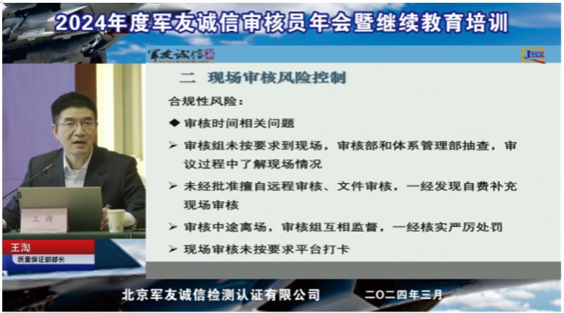2024年3月30日至31日,北京軍友誠信檢測認證有限公司(以下簡稱軍友誠信)召開了2024年度審核員大會。本次會議采用“主會場+分會場”、線上線下相結合的模式進行,主會場設在北京,依托分公司、辦事處資源分別在沈陽、西安、蘇州、廣州設4個分會場,共600余人參加會議,會議由公司趙顯立書記主持。
