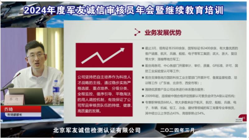 報告中,系統分析了軍品認證的形勢和發展趨勢,深度挖掘了公司面臨的挑戰和機遇,重點指出,2024年軍友誠信要以更實舉措、更優服務做強主業,在總體“穩”的基礎上,牢牢把握新時代管理體系認證、實驗室認可和檢測工作的新方向、新要求,拓展新業務模式,抓改革、促質量、強內功、創品牌,確保公司實現可持續發展。